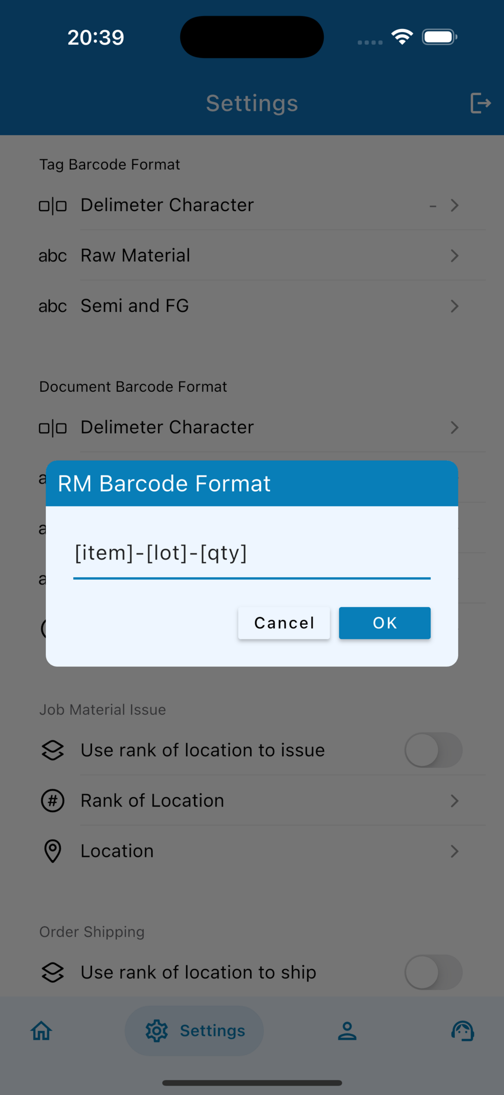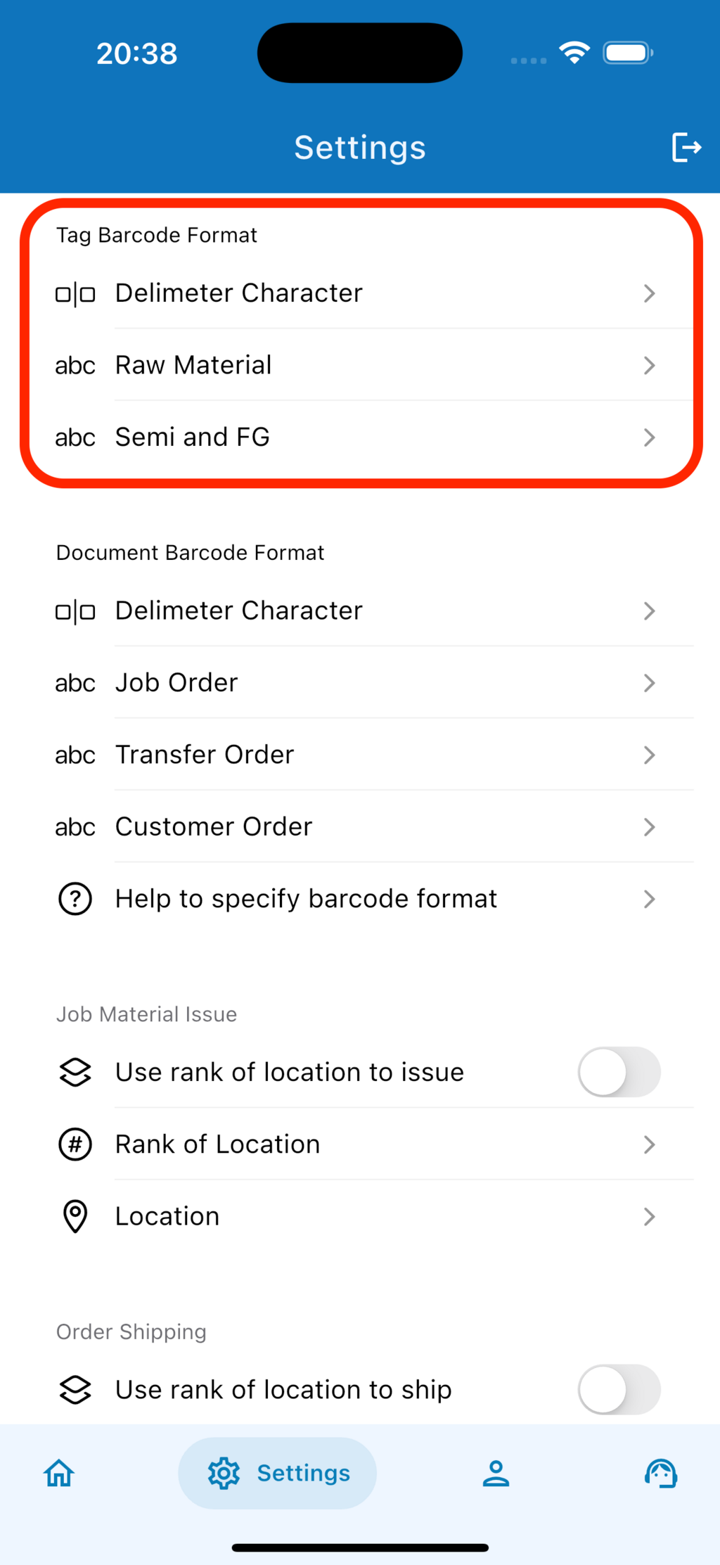 เพื่อให้แอปพลิเคชัน InfoSync สามารถอ่านและตีความข้อมูลจากบาร์โค้ดที่ท่านใช้งานอยู่ (เช่น ป้ายกำกับวัตถุดิบหรืองานระหว่างทำ) ได้อย่างถูกต้อง ท่านจำเป็นต้องตั้งค่ารูปแบบของบาร์โค้ดเสียก่อน โดยสามารถเข้าไปที่เมนู Settings > Tag Barcode Format